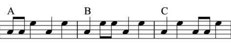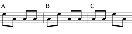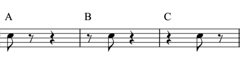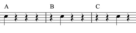 Das Pausen ABCEin Rhythmus als eine Folge von Tönen und Pausen. Da drei statt vier Schläge ab Buchstabe Q auf einen Takt kommen, wirkt das Tempo langsamer. |